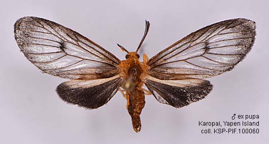 STATUS: A rare species. There is no doubt that Zygaenosia eximia Rothschild, 1936 is conspecific with Z. medialis Gaede, 1925. Both species were described in the other sex. Males have a black and orange abdomen while the female have an orange abdomen.