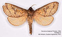 Species belonging to Elhamma and Aenetus are rather easy to identify but most Oxycanus species are very difficult to distinguish from each other. Many species show a wide range of colour varieties which are in many species overlapping. Oxycanus specimens must therefore be identified by the male genitalia of which drawings are depicted on the species pages. In most cases it is not necessary to dissect the genitalia from the abdomen, just brushing away the hairy scales from the genitalia should be sufficient to show the often dentated rim on the tegumen which is specific. Mounted specimens on the pictures shown in this website are all genitalia checked for their identification.