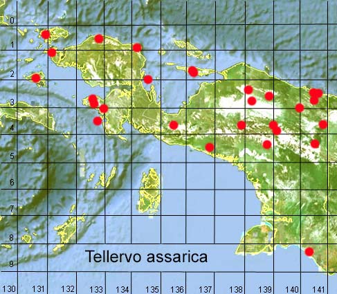 PAPUA LOCALITIES: Misool Island: Fakal; Waigeo Island; Salawati Island; Yapen Island: Ambaidiru, Natabuy; Mioswaar Island: Waprak; New Guinea: Apomani, Borme, Fakfak, Furu Camp (Foja Mts), MacGluer Gulf, Hotice Camp (Foja Mts), Kasurai, Kloofbivak, Kobakma, Mt. Kunupi, Kwerba, Lereh, Malawor (Mamberamo), Manokwari, Marina Valen, Obia, Salor (Merauke), Sota (Merauke), Sentani, Sumbole, Tambrau Utara, Timika, Ubrub, Waena, Wigoduk, Yongsu. Details in gazetteer.