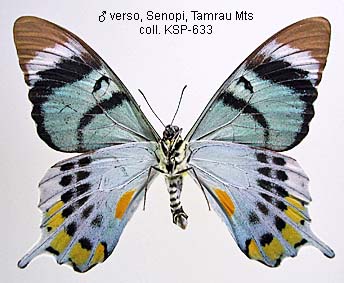 STATUS: A rare species, which is widely distributed on New Guinea. It mimics the Uraniid Alcides species (see the lower pictures), but together with the antennae, the underside is also very different.