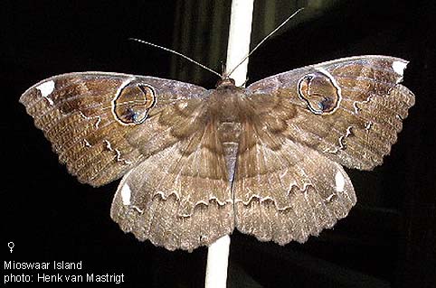 STATUS: A common species, mainly at lower altitudes. In New Guinea the dark forms are dominantly abundant. Some females are deep black with a bright white but narrow transverse band across both wings (f. leucotaenia). At the Islands in the Cenderawasih Bay the form with a broader band are more common (f. meforensis). The species replaces in the Wallacean region the Sundanian species Erebus ephesperis (Hübner, 1827). Both species are very similar but are in males easy distinguished by the irregular oblique band from base to eyespot in E. crepuscularis, while in E. ephesperis this band is straight. The white bar at the outside of the eyespot in males is in crepuscularis narrow and sharp, while in ephesperis this bar is broad and fading out. A few specimens from crepuscularis are known from Java, ephesperis has never been found on New Guinea.