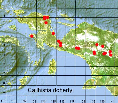 PAPUA LOCALITIES: New Guinea: Borme, Demaisi, Dorey (Manokwari), Mt. Goliath, Kapaur (Fakfak), Kloofbivak, Mt. Kunupi, Landikma, Langda, Mabilabol, Meni (Arfak), Menoo River, Mokwam, Neney Valley (Arfak), Nomnagihé, Oksibil, Resibivak, Upper Setekwa River, Sibil, Mt. Siwi (Arfak), Syoubri, Tenma Sigin (Star Mts), Utakwa River, Walmak, Wandammen Peninsula. Details in gazetteer.