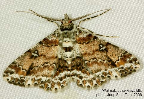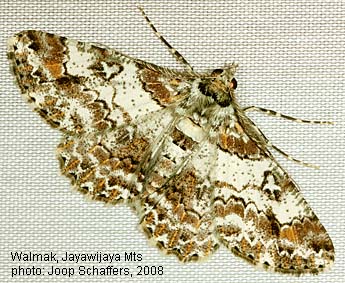 STATUS: Widely distributed in New Guinea. An extremely variable and common species. Probably everywhere in mountainous areas. A constant feature in its pattern is the "T" shaped reniform spot on the forewing which is blue-grey, in illustraria this marking is often a cross and smaller. Cleora hospita is more colourful than illustraria, black and white patterned specimens seem to belong to illustraria, but more research is necessary to confirm if hospita is just a synonym of illustraria or not.