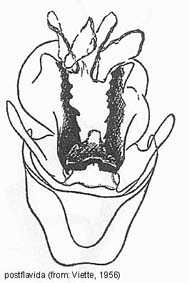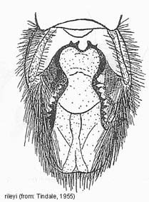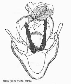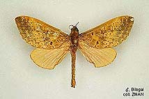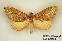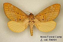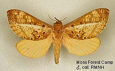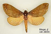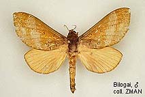 Species belonging to Elhamma and Aenetus are rather easy to identify but most Oxycanus species are very difficult to distinguish from each other. Many species show a wide range of colour varieties which are in many species overlapping. Oxycanus specimens must therefore be identified by the male genitalia of which drawings are depicted on the species pages. In most cases it is not necessary to dissect the genitalia from the abdomen, just brushing away the hairy scales from the genitalia should be sufficient to show the often dentated rim on the tegumen which is specific. Mounted specimens on the pictures shown in this website are all genitalia checked for their identification.